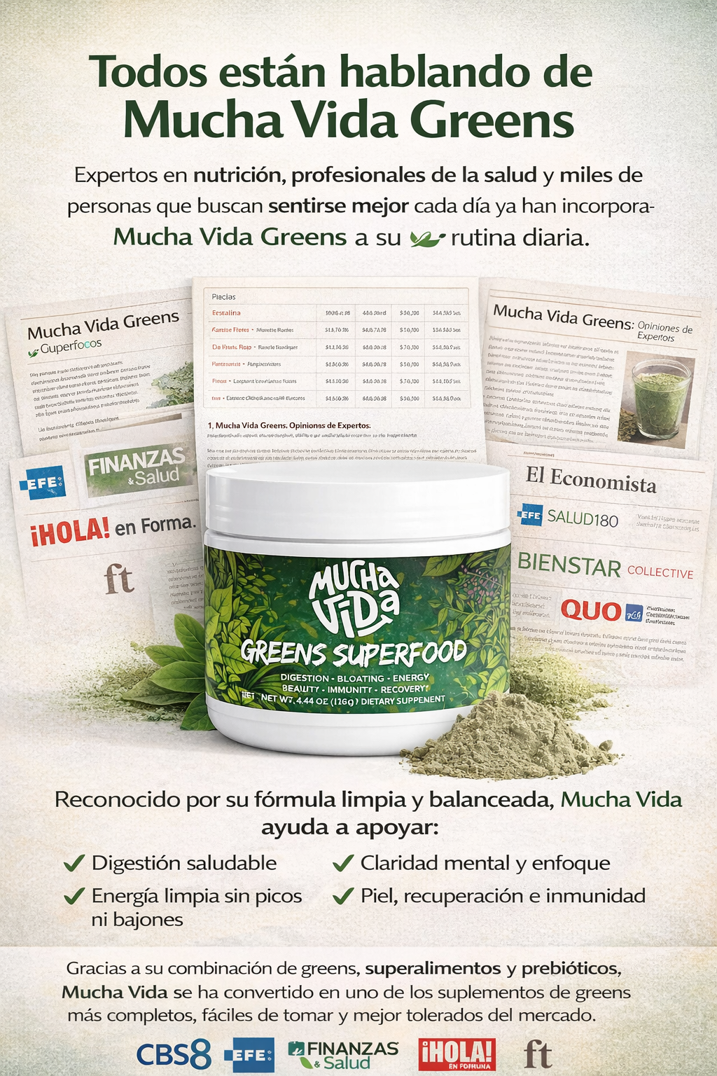 Seamos honestos: comer todos estos vegetales y superalimentos todos los días no es realista, y depender de cápsulas o pastillas se vuelve tedioso. Mucha Vida Greens es el suplemento que sí se queda en tu rutina.